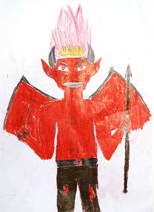 Dans la suite du travail Lukas se mit à exprimer ses fantasmes de violence dans sa vie quotidienne, au sein du service hospitalier et à l'école. Toutefois il arrivait, au moins en partie, à leur donner une forme figurée. Ceci est le dessin d'un diable qu'il a peint environ six semaines après le début de la période où il s'est trouvé intérieurement aux prises avec sa brûlure (voir Figure 1).